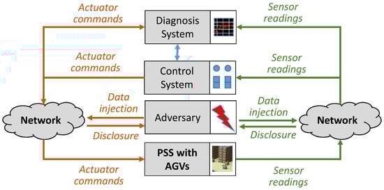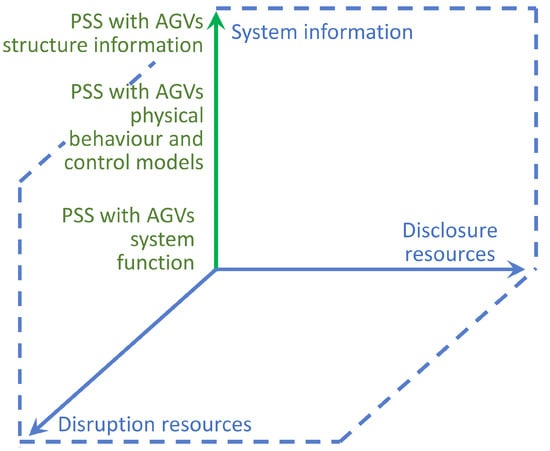 The view depicted in Figure 6 (based on earlier considerations and depictions [,]) was expanded to include PSSs with AGVs. Visible on the bottom of Figure 6 is the PSS with AGVs. This system receives actuator commands, e.g., drive motor or steering motor commands that are generated by a control system. The AGVs send sensor readings, e.g., from their odometers, ultrasonic sensors or cameras, to the control system. Usually, these data are also sent to a diagnosis system, the main objective of which is the detection of faults. Today, distributed systems are common for several reasons []. The network connection between the elements listed above can be used by an adversary either to disclose data or, even worse, to inject wrong or altered data. An attack carried out by the adversary will only be successful if knowledge concerning the PSS with AGVs is available to the adversary. Taking the aspects mentioned into consideration, a three-dimensional model can be derived (Figure 7).