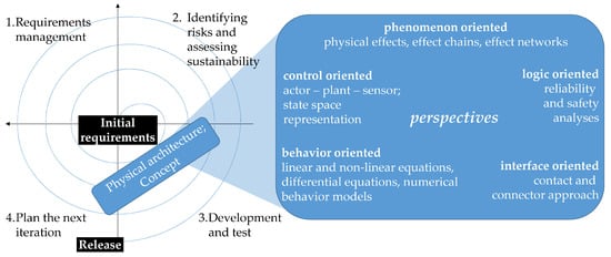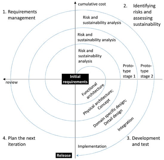 The starting point of this model is assessment of the initial requirements concerning PSSs with AGVs. It is assumed that an initial set of requirements is already available at the start of a project (e.g., as given by a customer). From this point, the PSSs with AGVs design is developed up to its release. The different stages are based on models which describe the level of abstraction of technical systems: functional architecture, physical architecture, domain specific design and integration [,]. In each stage, different aspects (“requirements management”, “identifying risks and assessing sustainability”, “development and test”, as well as “plan the next iteration”) are carried out. It is important to note that the model shown in Figure 8 is another representation of the two V-model loops in Figure 4. However, both representations focus on different aspects of the process and both have their specific merits. A discussion of the main elements of resilient design follows the spiral model shown in Figure 8.