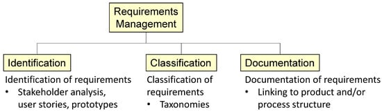 The core idea behind requirements management is that the conscious handling of the objectives of a PSS can prevent important functionalities, processes and characteristics from not being realized, and that possibilities for extending the life-time are enhanced. It is mandatory to include sustainability objectives in the requirements, and the longer-term consequences, as well as the systemic nature of sustainability requirements, has to be considered []. Requirements management can be understood as a systematic approach for managing requirements in order to identify the relevant requirements, to achieve consensus, to understand and document the wishes and needs of the stakeholders, as well as to manage the requirements for minimizing the risk that a system will not fulfill these wishes and needs []. This can be applied to both the physical and virtual parts of a PSS with AGVs; in fact, both parts should be managed in close coordination. Several techniques can be applied for identifying the requirements, for instance, stakeholder analyses, user stories and prototypes []. Several taxonomies have been proposed for the classification of requirements []. For the documentation of requirements, it is, furthermore, sensible to link the requirements to the structures of the technical system and its accompanying processes []. These aspects are summarized in Figure 9.