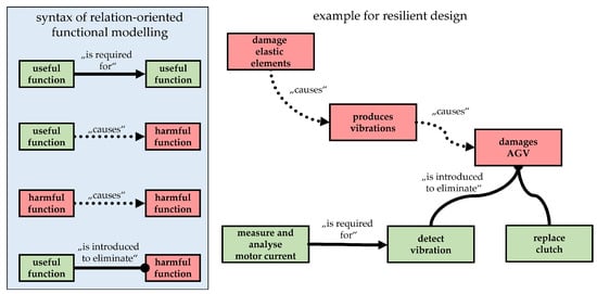 The blue box on the left side of Figure 12 describes the syntax of this kind of function modelling (based on []), while, on the right, an example of resilient design is shown. Figure 12 describes resilient design by means of the application of fail-safe pin coupling. Such couplings are designed in a special way which assures torque transfer even if internal flexible elements are destroyed. In this case, additional vibrations will be the result of damaged elastic elements. These vibrations can be used to detect the fault before serious consequences occur. However, in automated systems, no human being may be able to detect these vibrations. One possibility would be dedicated vibration sensors, but these can lead to increased system complexity and cost. One promising possibility could be motor current signal analysis (MCSA), as shown in Figure 12. This kind of analysis has been intensively researched; an example is that of hypergraph neural networks []. Another form of function model—a flow oriented function model—is depicted in Figure 13.