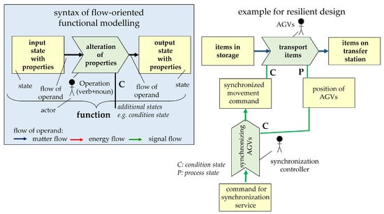 The blue box on the left side of Figure 13 describes the syntax of this kind of function modelling. The syntax is based on the function model as proposed by Ehrlenspiel and Meerkamm []. Operations, e.g., changes of an operand, are shown as arrows and are usually described with a verb and a noun. In this syntax the state of operands is also included, for instance, the state before and after an operation. The different kinds of flow of operands can be distinguished (see also [,]): matter, energy and signal. The signal flow reflects the main parts of services. Additionally, auxiliary flows of operands can be connected via auxiliary states. For auxiliary states, three kinds can be distinguished: condition states, process states and additional states. Condition states describe states of operands which are necessary for the realization of an operation. Process states describe states of auxiliary operands which are influenced by an operation. Additional states are sometimes necessary to describe equivalence relations. In the proposed syntax, actors can also be shown in order to increase clarity and faciliate understanding of the function model; actors are function carriers, i.e., entities which realize an operation. The example given describes the transportation task within an PSS with AGVs, together with the accompanying service synchronization. It is clear how the PSS synchronization control system can provide synchronized movement commands, but it needs position information from the AGVs. By means of function models, it is possible to describe the connection between physical system elements and services, and, through this, to support engineers in the endeavor of resilient design.