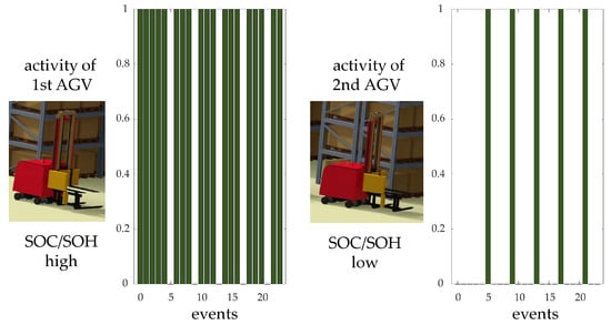 Another perspective that is interesting in the context of PSSs, is the control-oriented perspective, which employs actor–process-sensor models and state–space representations []. For PSSs with AGVs, advantageous services would ensure that, in the case of AGVs with different states of charge (SOC) or states of health (SOH), the operation load is distributed on the different AGVs in an optimum manner. In earlier research, cooperative redundant AGVs were the focus of investigation and a health-aware model predictive control scheme was developed which was able to balance the operation load—the activities—of AGVs dependent on their SOC and/or SOH []. Figure 15 shows an exemplary result.