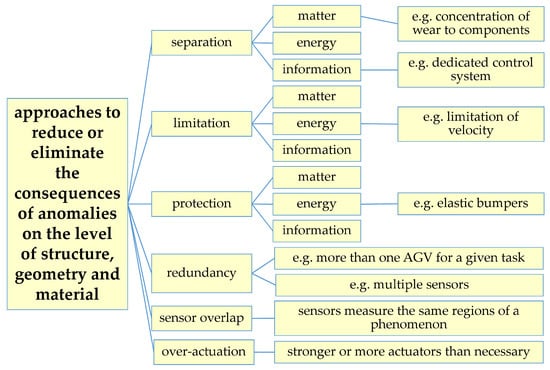 Wear in technical systems is usually present at only a few surfaces, but may lead to failure of the complete system and to the need for early replacements if wear happens at components which cannot be easily replaced. Wear in technical systems occurs frequently at surfaces with relative movement but also at interface surfaces with high electrical currents and within conductors with high electrical currents. Aging and wear can also be caused by chemical processes, such as corrosion and oxidation. Common causes for aging are pulsating loads and pulsating pressures. Similar to disturbances and tolerances, aging and wear can severely alter product performance. Aging and wear can lead to unscheduled downtime in technical systems and to early replacement of the system. Prevention of these downtimes is the main purpose of so-called predictive maintenance. However, predictive maintenance requires in-depth knowledge of the current state of the system components in terms of wear and aging. A considerable body of research has focused on estimating the remaining useful life (RUL) of system components []. In PSSs with AGVs, the knowledge of the RUL can be used for planning predictive maintenance activities, but also for controlling the system in a manner that will prolong the operation time of the complete system. This is possible, for instance, if redundant elements receive less operational load []. As the operation time of a technical system is expanded, such capabilities can also be understood as aspects of resilience. Such possibilities are only present for certain system configurations. It is reasonable to integrate the issues of aging and wear, as well as options for reducing their consequences, into a holistic resilient design—this may contribute greatly to sustainable engineering.