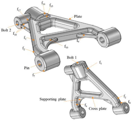 This study considers geometrical uncertainty when determining the sizes of the suspension control arm. The sampling of dimensions was done in accordance with design margins or manufacturing faults by establishing the tolerance range of each measurement. Following that, the sampled dimensions were used for geometric modeling, and model updates were carried out using finite element (FE) modeling in COMSOL. A few common control arm dimensions were chosen as the geometrical uncertainty inputs from the design and deformation failure analysis perspectives, as shown in Figure 1. In engineering practice, a normal distribution is typically used to model dimensional tolerance []. According to DIN EN ISO 286-1 [], the geometrical tolerances of these dimensions are considered to be ±0.1% changes from the planned size based on the tolerance requirements. Moreover, for this study, the COV for each dimension was considered to be 0.1%, as shown in Table 1.