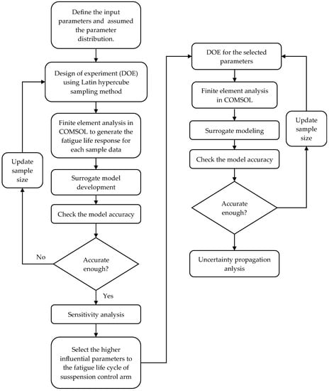 Therefore, it is crucial to compute how uncertainties affect model predictions. This study suggested an uncertainty propagation and sensitivity analyses platform in order to measure the variability in fatigue responses of the front-lower suspension control arm. For the sensitivity analysis of the suspension control arm, the Sobol indices approach was suggested, and a Morris one-step-at-a-time (MOAT) parameter screening method [] was applied for comparison. Surrogate models were compared to replace the computationally expensive finite-element analysis in COMSOL Multiphysics version 6.1 by generating a training sample data using Latin hypercubes (LHCs). A surrogate-based Monte Carlo simulation was then performed to determine the suspension’s lower control arm fatigue life uncertainty. Finally, confidence intervals were computed to quantify the uncertainty in the fatigue life of the lower control arm of the automobile suspension.