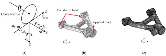 Suspension control arm: (a) forces acting on vehicle tires; (b) 3D model and boundary conditions; and (c) geometry mesh.