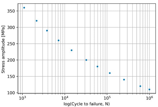 where is the stress amplitude, which is determined from the difference between the peak stresses and the mean stress ; is the number of the fatigue lifetime cycle; is the modification factor; and is the S-N curve. Based on past experience, the modification factor caused by the production process of machining can be set between 0.6 and 0.8 [].