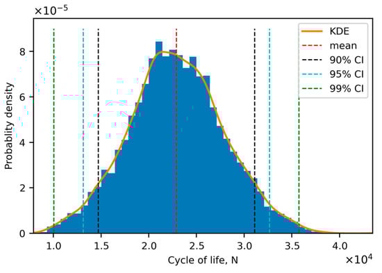 Then, the surrogate model was developed by generating 300 instances of sample data while using LHS for the chosen parameters. Table 4 also describes the validation results of the developed surrogate model for the fatigue life prediction. Based on the RMSE result, the adaptive Gaussian process surrogate model showed less errors than the others. A Monte Carlo analysis was then conducted, using an adaptive Gaussian process surrogate model, to evaluate the uncertainty propagation.