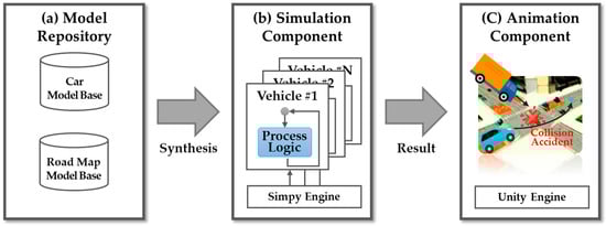In this paper, we propose a simulator that mutually complements the simulation and animation components to provide vehicle crash scenarios. Our proposed simulator synthesizes and simulates models selected from our repository and animates the simulation results. The model repository stores vehicle and road map models in two bases. The proposed simulator synthesizes the vehicle model developed by Simpy [17] and the road map model applying the Lambda function [18,19] to describe a vehicle crash. In the proposed simulator, the simulation component performs the synthesized model through the Simpy engine. Next, the animation component receives the simulation results and reenacts the vehicle crash. Thus, our simulator combines the two components to effectively illustrate vehicle crash scenarios.