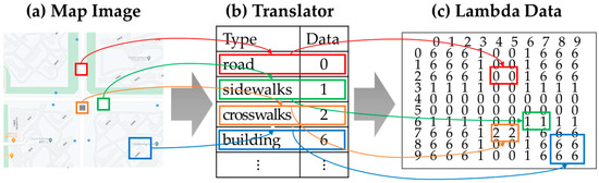 The environment model uses lambda data for various vehicle crash environments. After selecting a point (e.g., intersection, curved road) on the map, the points are converted into lambda expressions. Figure 3 shows our map translator of the environment model to convert to lambda data. In the lambda data, 0 represents roads, 1 represents sidewalks, 2 represents crosswalks, 6 represents buildings, etc. The converted lambda expressions represent the vehicle movement during simulation execution, considering the simulation time and speed.