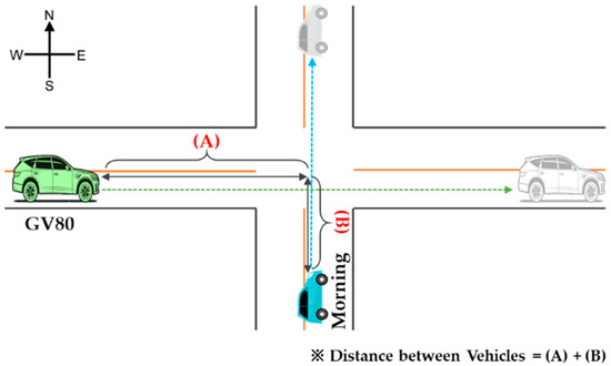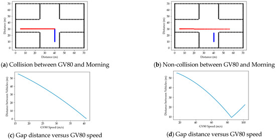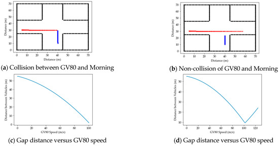 In order to express the collision or non-collision of vehicles in the intersection environment of Figure 6, we set the same speed while changing the acceleration. Their speed was 60 km/h (0.16 m/s), the GV80’s acceleration was 0.002 m/s, and the Morning’s acceleration was 0.16 m/s.