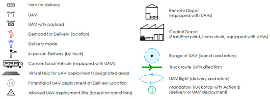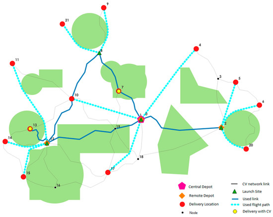 Several items must be delivered from a Central Depot (CD) to customers at Delivery Locations (DLs). CVs travel through a fixed network, whereas UAVs are more flexible, although they are obliged to navigate around potential no-fly zones. The CV is not limited by its operational range and is expected to be able to complete the entire journey without refueling or charging. The UAVs are assumed to be electric, with battery capacity and energy consumption performance defining their maximum range. A battery swap is executed at the start of operations or during the UAV preparation at each site when the same UAV is used again. Each item is assigned to a mode for the final stretch or the entirety of the journey.