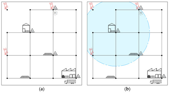 Setup Example 1—Infrastructure, demand, and UAV range: (a) infrastructure and demand; (b) UAV range (indicative, from one of the launch sites).
