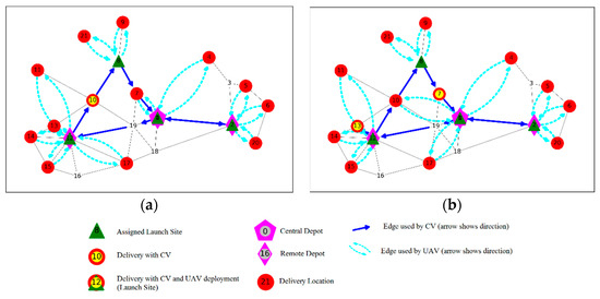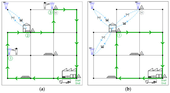 Setup Example 1—Possible assignment and routing solutions: (a) solution 1: deliveries with truck and with UAVs from Remote Depot; (b) solution 2: deliveries only with UAVs from Remote Depot.