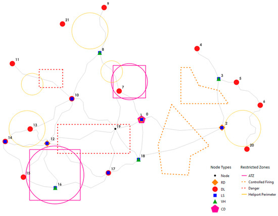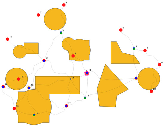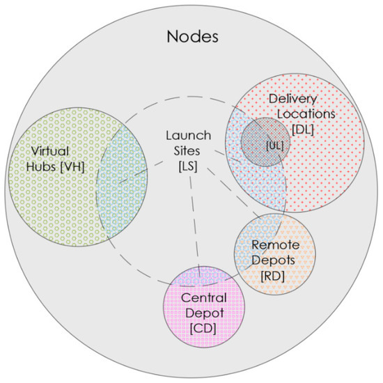 Launching and collecting a UAV is possible in other locations than just the CD and DLs. Additionally, not all DLs are potential LSs. This is different from the assumption commonly made in the literature about cooperative truck–drone systems, where drones can only fly from or to customer locations or the CD. A schematic representation of node sets is shown in Figure 5.