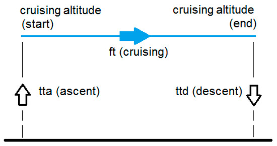 “Time to ascend” (tta) and “time to descend” (ttd) values are considered. Considering only direct flights between nodes (no stops at other nodes), the total flight time “tftij” between two points is calculated as
