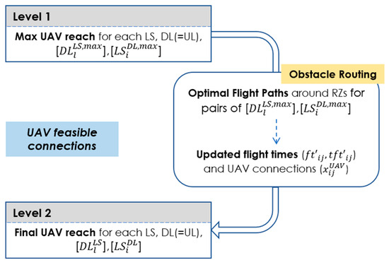 Preliminary analysis defines which sites are finally allowed for UAV deployment (Launch Sites (LSs), among CD, RDs, VHs, and some of the DLs) and which pairs of DLs and LSs are within the maximum UAV range (straight flight path) of each other (DLlLS,max, LSiDL,max). For the above pairs, actual optimal paths around RZs are estimated, and UAV-feasible connections are again filtered based on the UAV’s range. Each item is then associated with potential service nodes (Service Nodes Pool (SNk)). A service node for an item may be its own DL node (if within the CVN) or any allowed LS that is reachable by UAV. Analysis “a2” offers an alternative way to perform the assignment later (task T1). Instead of assigning items based on their Service Nodes Pool, we could inversely use the sets of the launch sites. This would be helpful if we were to base our assignment on clustering strategies.