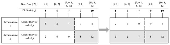 To obtain the optimal solution, we are setting up a nested two-level optimization process, seeking the optimal assignment of items to a service node (lk) and optimal CV routing. Each time an assignment iteration is produced, a set of mandatory nodes (TvM) for visit emerges. At each of these nodes, waiting times (wti) for the CV are calculated based on the actions required (e.g., in-person delivery, UAV launch and recovery, items delivered to an RD for UAV deployment by the personnel). The shortest paths () between mandatory nodes are calculated using the given CVN and a new “shell” network is created. The shell network is constructed by a subset of mandatory nodes and the travel costs between them. Routing for the CV is then a matter of selecting the best order of visits () across mandatory nodes. (In our case study experiments, we have opted to use the nested GA with a custom gene structure for tasks T1, T2, and an A* algorithm for the shortest path analysis s2.)
