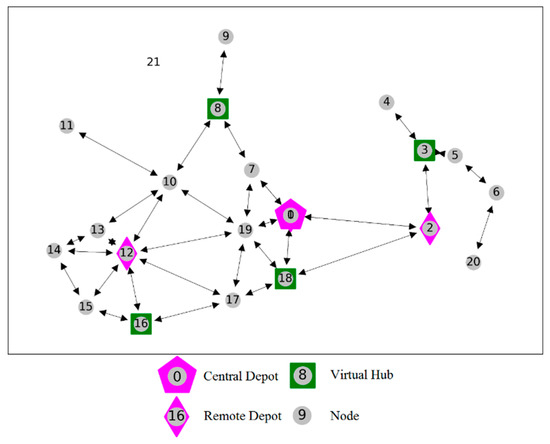 In our setup, UAVs can be launched or recovered at allowed locations throughout the network; these locations are not limited to the DLs or the CD, but additional Virtual Hubs (VHs) for convenient CV layover and in situ UAV deployment, and Remote Depots (RDs) with adequate UAVs are also available. When UAVs are deployed from the CD or the RDs, the CV does not have to wait for the UAVs to return. However, at RDs, a certain service time for item delivery is implied before the depot’s personnel assume the package mounting and UAV deployment activities. At any other location where UAVs are mass-deployed from the CV, the latter must wait for the last UAV to return. Under the given network and introduced demand and restrictions, the goal is to find the best combination of item assignment and CV routing in terms of the total time to complete operations. A simplified illustration of this setup is presented in the following figures (Figure 1, Figure 2 and Figure 3).