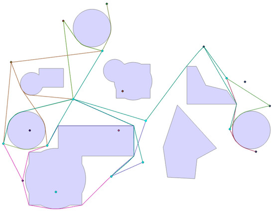 Current air traffic regulations in the US and the EU prohibit commercial UAV flights at altitudes below 400 ft (120 m), and certain restricted areas are imposed [41,42]. As such, the UAVs will not always be allowed to travel in a straight line while at cruising altitude. Such forbidden areas are commonly distinguished into the following categories: Prohibited Areas: P (usually military); Restricted Areas: R (monuments, environmental, military flight areas); Danger Areas: D (usually training flights); Controlled Firing Areas: C (military exercises) [42,43,44,45,46]. We will refer to all the forbidden areas as Restricted Zones (RZs). UAVs will have to navigate around the RZs, following an optimal path. Several methods have been proposed for acquiring the optimal path around obstacles: for instance, Bug 1 and Bug 2 [47], Tangent Bug [48,49], using a tangent visibility graph and then employing Dijkstra among possible paths [50], the Artificial Potential Field [51], and others.