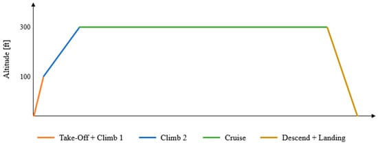 As illustrated in Figure 1, the profile of the mission is made up of an initial climb to 100 ft above ground level (AGL) in 30 s. At this altitude, the mission can already be started. The rest of the climb to the cruising altitude of 300 ft AGL is made with a rate of climb (ROC) of 0.5 m/s, and then the cruise is maintained for the rest of the mission for at least 6 h until no energy is available.