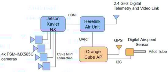In addition to the PVCs, appropriate avionics and payloads for the designated mission were chosen, and their architecture is displayed in Figure 2. First, we chose four FSM-IMX565C cameras that provide a 360° view with 4K resolution. The Jetson Xavier NX computer and Boson carrier board were elected to process the data gathered by the cameras. The Herelink transmitter and Orange Cube autopilot from CubePilot were selected to transmit images, video, and telemetry to the ground station while ensuring radio control and automatic flight. Finally, the airspeed sensor ASPD-4525 from Matek System was included in the architecture. Overall, the payload weighs approximately 500 g and consumes 45.5 W.