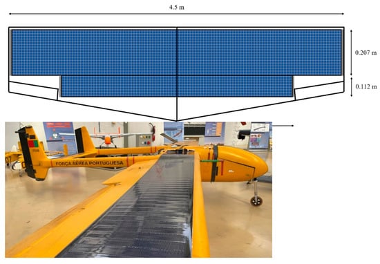 It is then consensual that the fixed-wing design is the most appropriate. While simultaneously fulfilling the need to install 1.27 m2 of PVCs, an aerodynamically efficient wing is also required. Therefore, we decided to apply taper to the wing. The chosen profile for the study was the FX-63-137, the airfoil with the largest available area studied before. After some calculations, the maximum taper ratio that can be applied is 0.69. As a result, the wing root chord measures 0.45 m and the wing tip chord 0.31 m, allowing the PVCs to be displayed in the wing as shown in Figure 3.