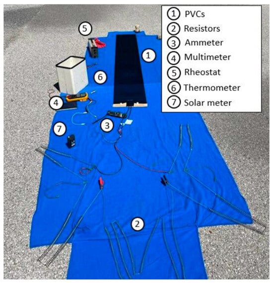 Furthermore, to estimate the cell’s perfection, the fill factor (FF) for all the trials is calculated based on [,], achieving an average value for the PVC module of 51.6%, which means that the curve is approximately half of the perfect rectangle formed by the VOC, short-circuit current (ISC), and a perfect maximum power point (MPP). Additionally, efficiency is a very commonly used parameter to compare different types of cells. An efficiency between 11.3% and 12.3% was evidenced in the different trials.