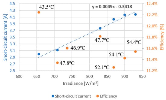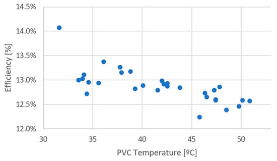 Lastly, the average efficiency of the PVCs is 12.9%, which is significantly higher than in the first test of this subsection, ranging between 11.3 and 14.1%. The inversely proportional relationship between efficiency and temperature was confirmed in this case, with a wider range of temperatures as appropriate, as shown in Figure 9.