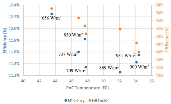 However, the PVC temperature effect in  does not tend to vary with temperature, whereas  varies in the opposite direction, increasing with temperature. Figure 7 depicts efficiency and fill factor decline with temperature increments, as expected. The unexpected results in temperature correlation can be explained by the short temperature range recorded during the tests and because irradiance and temperature varied as the tests were not conducted in a controlled environment []. Irradiance is also represented for each efficiency point.