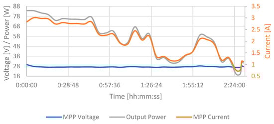 Afterwards, at the end of the afternoon, 2 h and 30 min of testing were completed following the start of the battery discharge. This means an estimated SPUAV endurance of 7 h 49 min, with irradiance ranging from 750 to 160 W/m2. The battery, PVCs, and MPPT reached maximum temperatures of 37.1, 50.9, and 41.6 °C, respectively. PVC voltage has only minor oscillations, indicating that the power output variation due to irradiance is managed by lowering the module’s current, as visible in Figure 8. Moreover, as irradiance increases, the battery’s discharging curve slows down, except when the battery has already reached a high DOD.