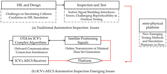 With the standardized promotion of in-vehicle Automatic Emergency Call Systems (AECSs), in-vehicle emergency mobile communication has become an essential component of vehicle safety assurance. The testing and experimentation of AECSs have also become important research directions in the field of Intelligent Connected Vehicles (ICVs) [1,2]. In recent years, with the development of mobile communication technologies (2G~5G) and the capabilities of Global Navigation Satellite Systems (GNSSs), the functionality of AECSs has become increasingly comprehensive. Therefore, in order to assess the performance of an AECS more comprehensively, it is necessary to conduct research on testing methods and establish a robust performance evaluation system. The function of an AECS is to acquire and transmit accurate vehicle location information after an accident, ensuring its trigger ability and compliance with international standards. The reliability of communication connections and the transmission of the Minimum Set of Data (MSD) are the focal points of system testing [3]. However, during the transmission of the MSD, the GNSS signals received by the positioning system are susceptible to interference and spoofing; in Figure 1b, the AECS-related testing for the ICV test is compared to the traditional Hardware-in-the-Loop (HIL) testing in (a), where the establishment of communication connections is constrained by the accident environment. As a result, there is a significant gap between the actual AECS verification and certification and the system’s performance under real accident conditions, further affecting the authenticity of the tests. Moreover, conducting complex real vehicle tests presents challenges in ensuring reproducibility. Therefore, there is a need to integrate accident scenarios and communication transmission reliability in the research of AECS tests and verification methods for ICVs.