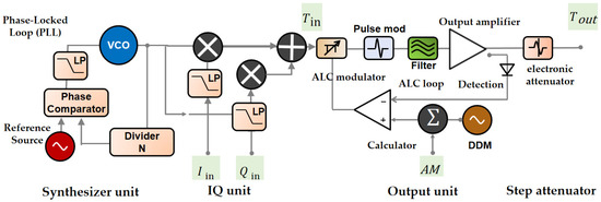 In the equation, SLO represents the local reference source quartz crystal oscillator generating the local oscillator sinusoidal signal [28], and denotes the oscillator frequency. Through the IQ unit, phase modulation and frequency conversion are performed to simulate variations in the carrier frequency and carrier phase. This process can be represented as