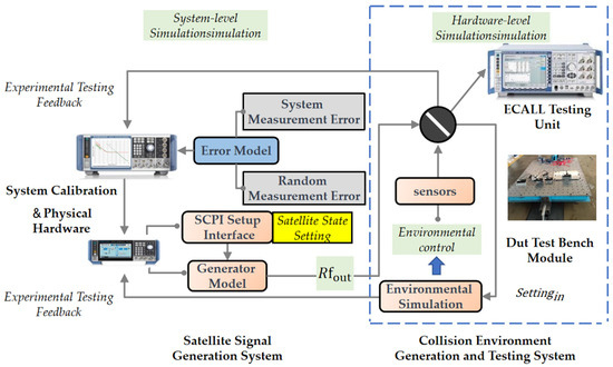 Furthermore, conducting collision tests on Intelligent Connected Vehicles is costly, and the control process is variable, which limits their application in large-scale testing and evaluation. It becomes challenging to comprehensively test and simulate the system, as well as simulate various emergency situations and evaluate the system’s responsiveness in different scenarios. In this regard, in-vehicle simulation provides a solution by rapidly establishing virtual collision scenarios, flexibly adjusting collision parameters, and facilitating the creation of complex models in conjunction with physical components. Wang proposed a general model considering the cooperative interaction between humans, vehicles, and the road environment, and used this model to study vehicle collision warning algorithms [20]. Some researchers have focused on studying the factors affecting the vehicle operating environment. Rana, Shohel established a monitoring system based on road surface vibration characterized by roughness parameters using vehicle dynamics and parameter estimation methods to build a data acquisition platform [21]. On the other hand, in terms of collision data research, Novat Norris employed machine learning methods based on Bayesian inference to statistically analyze the field data of collisions involving autonomous vehicles [22]. Chen, on the other hand, developed a collision prediction model using a GA-optimized neural network, with six parameters related to collisions selected as inputs to predict collision severity. The model also accounted for the impact of vehicle-to-vehicle communication [23]. However, there are few comprehensive studies that combine environmental factors with the transmission of positioning information in an AECS. Therefore, by leveraging the characteristics of in-vehicle simulation, a semi-physical simulation system can be established to simulate various environmental conditions realistically while ensuring stable triggering of the vehicle. This approach can harness the advantages of collision simulations and software simulations, generate random or specific positioning information through the simulation of the Global Navigation Satellite System (GNSS) [24,25,26], and address the challenges of real vehicle testing and multi-scenario testing [27].