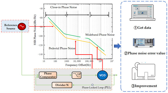 The error analysis section is used to evaluate the measurement errors and stability of the system, conducting an analysis of both the linear and nonlinear effects on the system measurement errors [36]. Factors such as signal attenuation, noise, multipath effects, and others are considered in their impact on the positioning performance. Additionally, we pay attention to random measurement errors with repeatability, such as temperature drift. By analyzing these error sources in detail, we can understand the system’s performance and reliability under different conditions. As shown in Figure 4, a simplified phase noise model is obtained, depicting its relationship with the corresponding system modules. Various components in the simulation system exhibit nonlinear characteristics influenced by environmental factors, leading to nonlinear error effects. By analyzing the phase noise, we can determine the locations where environmental factors affect the system.
