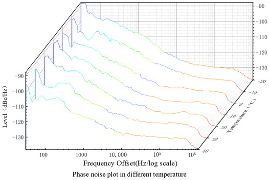 Taking the phase noise at 1575.42 MHz as an example, the simulated errors generated in high- and low-temperature environments were divided into seven gradients based on the experimental conditions. A comparative test was conducted with the temperature ranging from −20 °C to 40 °C. Through simulation and experimentation, Figure 5 presents the single-side phase noise within the integrated measurement range of 10 to 10,000 KHz under different temperature gradients. It reflects the frequency offset at this frequency center.