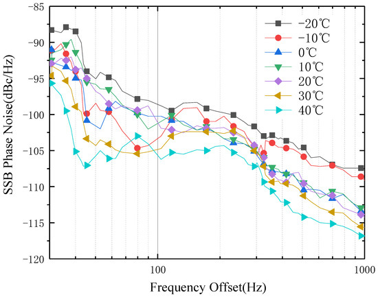 The influence of temperature on the system is primarily present in the near-carrier range of 10 to 1000 Hz, as shown in Figure 7. From the graph, it can be observed that at −20 °C (low temperature) compared to 40 °C (high temperature), the maximum error value is 11 dBm.