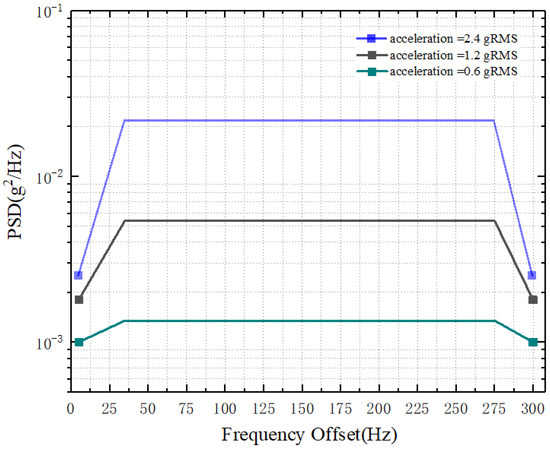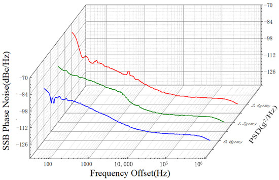 In the experiment, three different environmental conditions with different power spectral densities were used. Under a temperature of 20 °C, the signal generation system was placed inside the vibration environmental chamber, and different vibration gradients were set, as shown in Figure 8. Figure 8 presents the phase noise results of the system under three different power spectral density conditions. Through the simulation experiment, the influence of the set value of random vibration on the phase noise can be obtained. It can be observed from the figure that both the near-carrier phase noise in the range of 10–1000 Hz and the pedestal phase noise in the range of 1000 Hz–100 KHz are affected by vibration interference.