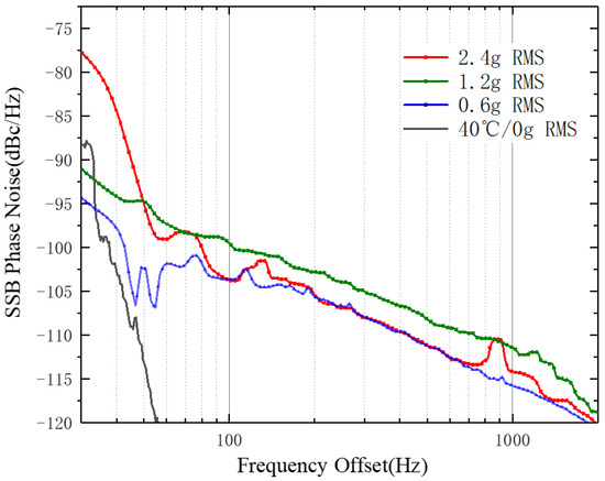 Additionally, Figure 10 shows a comparison of the phase noise curves in the near-carrier range for the 0–100 Hz interval. Under the conditions of 2.4 g RMS and 0.6 g RMS, the maximum phase noise error is 17 dBm, which is significantly higher than the phase noise under the gray curve representing no vibration (0 g RMS) and high-temperature conditions in the same frequency center. Compared to the error caused by temperature, vibration has a greater impact on the frequency in the near-carrier range. Under the 1.2 g RMS condition, the impact of vibration on this frequency range is relatively smooth.