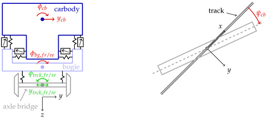 This paper focuses on lateral dynamics; therefore, the following degrees of freedom (DOF) are considered for the carbody: Lateral displacement , roll angle and yaw angle . In addition, each bogie is allowed to rotate around the x-axis by the angle . This yields a model with 5 DOF, as illustrated in Figure 1. Note that a more detailed description is given in Figure A1.