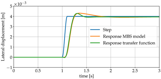 During the creation of the analytical model, track irregularities are considered explicitly. In order to achieve this, track errors are modelled as base excitation of the axle bridge; see Figure 1. The interaction between wheel and rail is simplified as follows. The running gear design of the NGT includes DIRW. While velocity-dependent hunting motion no longer applies, lateral guidance control is required in order to prevent flange contact; see [2]. The controller designed for this purpose significantly influences the axle bridge movement and, thus, the impact of track errors upon carbody dynamics. Figure 2 illustrates the step response of the axle bridge with respect to a lateral displacement. The result was obtained from a multibody simulation (MBS) of the NGT at a velocity of 120 km h−1. In general, the response depends on velocity. In order to take this complex closed-loop behavior into account when creating the model, it is proposed to approximate the resulting lateral dynamics of the axle bridge via a transfer function. The algorithm used for the determination of the transfer function parameters is based on a least squares method; see [21]. It is found that a transfer function with a numerator degree of 1 and denominator degree of 2, as given in Equation (2), is sufficient to approximate the illustrated response; see Figure 2. To conclude, the axle bridge of the analytical model is excited by track irregularities which have been filtered through a velocity dependent transfer function.