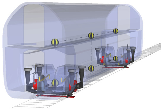 A track has been chosen that is comparable to EN 14363 test zone 1 [25], see Figure A2. In this scenario, track parameters like curvature and superelevation are not expected to have a significant influence upon lateral dynamics. Lateral and crosslevel track irregularities are chosen according to ERRI B176 high [26]. The standard deviation of lateral alignment is 1.19. At a speed of 120 km h−1, this is within the target test range TL90 defined in EN 14363; see Table 1. For the crosslevel direction, no specifications are made in EN 14363. In addition, TL90 applies to the left and right rail separately, while ERRI B176 is for track-related excitations (i.e., for both rails at once). In order to ensure that the TL90 criterion for the longitudinal level is not exceeded, no additional vertical track irregularities are used. For the selected crosslevel excitation, the standard deviation of vertical distance between the left and right rail is 2.12 mm. Therefore, the requirements of EN 14363 regarding track geometric quality are met; see Table 1. The evaluation of ride comfort is carried out according to EN 12299 [27]. This means the variable is determined, which incorporates lateral acceleration measured at several positions on both floors of the carbody; see Figure 3.