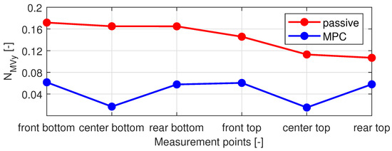 The results obtained in Section 3 indicate that the analytical model given in Equation (5) in combination with the assumed impact of irregularities is suitable for predicting future dynamic behaviour of the carbody. Using MPC, it was shown that, compared to a model of the NGT with passive secondary suspension, a significant increase in lateral ride comfort can be achieved; see Figure 4. It is noticeable that better values are obtained near carbody’s center of gravity compared to measurement points above the front and rear bogie. Consequently, ride comfort is significantly influenced by carbody yaw motion. In contrast to this, between the upper and lower floor no larger influence is detectable. Therefore, roll motion seems to be suppressed effectively.