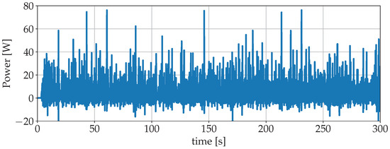 By integrating power over time, the energy consumed by the actuators is obtained. Since EN 12299 prescribes measurement durations of 300 s, the time period is chosen accordingly. At a speed of 120 km h−1, this corresponds to a track length of 10 km. Figure 5 shows the required power of a lateral actuator during simulation with peak values of approx. 80 W. In addition, negative values of power can be observed. This offers potential for recuperation.