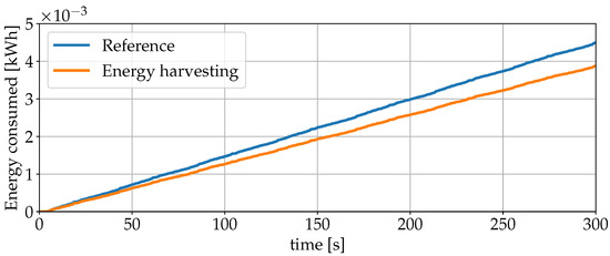 The total energy summed up over all actuators of a coach is illustrated in Figure 6. For the considered track scenario, 4.5 W h of energy is consumed. For comparison, the same simulation is carried out using actuators with energy-harvesting capabilities. In this case, energy consumption is 3.9 W h, which corresponds to a reduction of 13%. Assuming an annual mileage of 500,000 km, the energy consumption for the reference case adds up to 225 kW h each year.