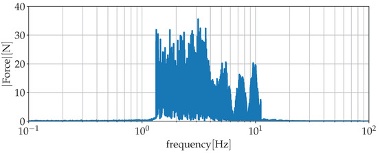 The requirements regarding power and energy usage of the actuators are quantified in Figure 5 and Figure 6, respectively. The energy consumption required in order to counteract track irregularities is rather low compared to other consumers. However, especially on curvy tracks with high cant deficiency, lateral centering is a relevant part of active secondary suspension; see [29]. In order to investigate energy demand holistically, both needs to be considered together. Another important aspect is the requirements regarding actuator dynamics that must be fulfilled. In Figure 7, Fourier transform is applied to a signal that represents the force of a lateral actuator. Forces up to a frequency of 10 Hz can be observed. At a speed of 120 km h−1, track excitation defined by ERRI high lies in this frequency range. While this was to be expected, it poses a challenging demand for the actuators. For example, in their studies on active secondary suspension, Orvnäs et al. used an electro-hydraulic actuator that only performed well up to 6 Hz; see [30]. However, the main goal of this paper is to provide a functional demonstration of MPC. Its suitability as a ride comfort controller has been proven. Lowering the required frequency range of the actuators by reducing controller gains or switching from active to semi-active suspension is an important issue which will be investigated further.