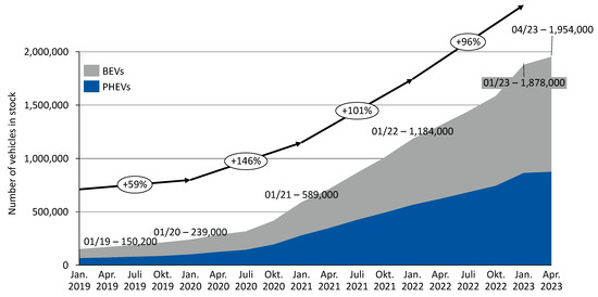 Number of BEVs and PHEVs in stock in Germany by quarter [38].