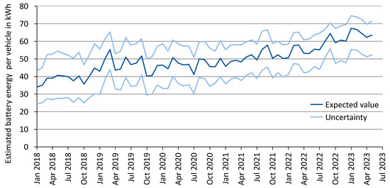 Average battery energy per vehicle of BEVs registered per month in Germany. The dark blue line represents the expected value for the battery energy per vehicle while the light blue lines mark the uncertainty window around that value. Derived from [40] with monthly values based on [41] combined with a catalogue of technical vehicle data [27].