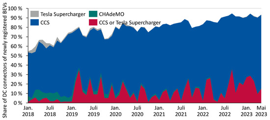 For the years observed, the car registrations were retrieved from the German Federal Office for Motor Traffic (in Flensburg, Germany, “Kraftfahrtbundesamt”, KBA) [26] and merged with a catalogue containing technical car data from the General German Automobile Association (“Allgemeiner Deutscher Automobil Club”, ADAC) [27]. Based on this approach, the battery capacity, charging power, and DC fast-charging connectors could be determined for most car models. This error range is created because of the fact that the KBA does not assign model identifiers if vehicles do not differ strongly. Since the number of vehicles that we could assign technical properties to does not exactly match the actual number of registered battery electric vehicles (BEVs) and of plug-in hybrid electric vehicles (PHEVs), scaling was performed for each datapoint reported. Since the plots shown in this paper rely on different primary data sources, we report the precise data sources in the caption of each plot separately.