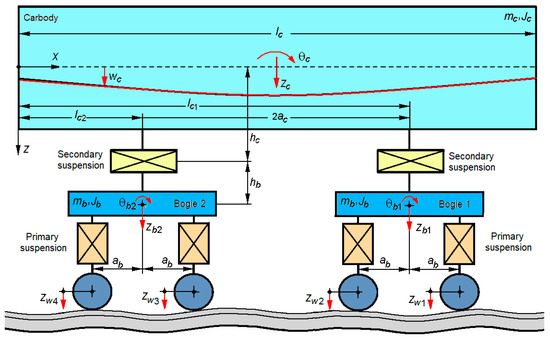 The following vertical vibration modes of the carbody are considered: bounce, pitch, and the first vertical bending mode. The vertical displacement of the carbody corresponding to the bounce, denoted by zc, and the pitch rotation angle of the carbody, denoted by θc, are highlighted in Figure 1. The vertical displacement of the section of the carbody located at the distance x from the reference system at time t, is denoted wc(x,t). This displacement results from the overlap of the displacements corresponding to the three modes of vibration of the carbody—the bounce, the pitch and the first mode of vertical bending, corresponding to the relation